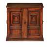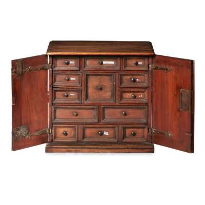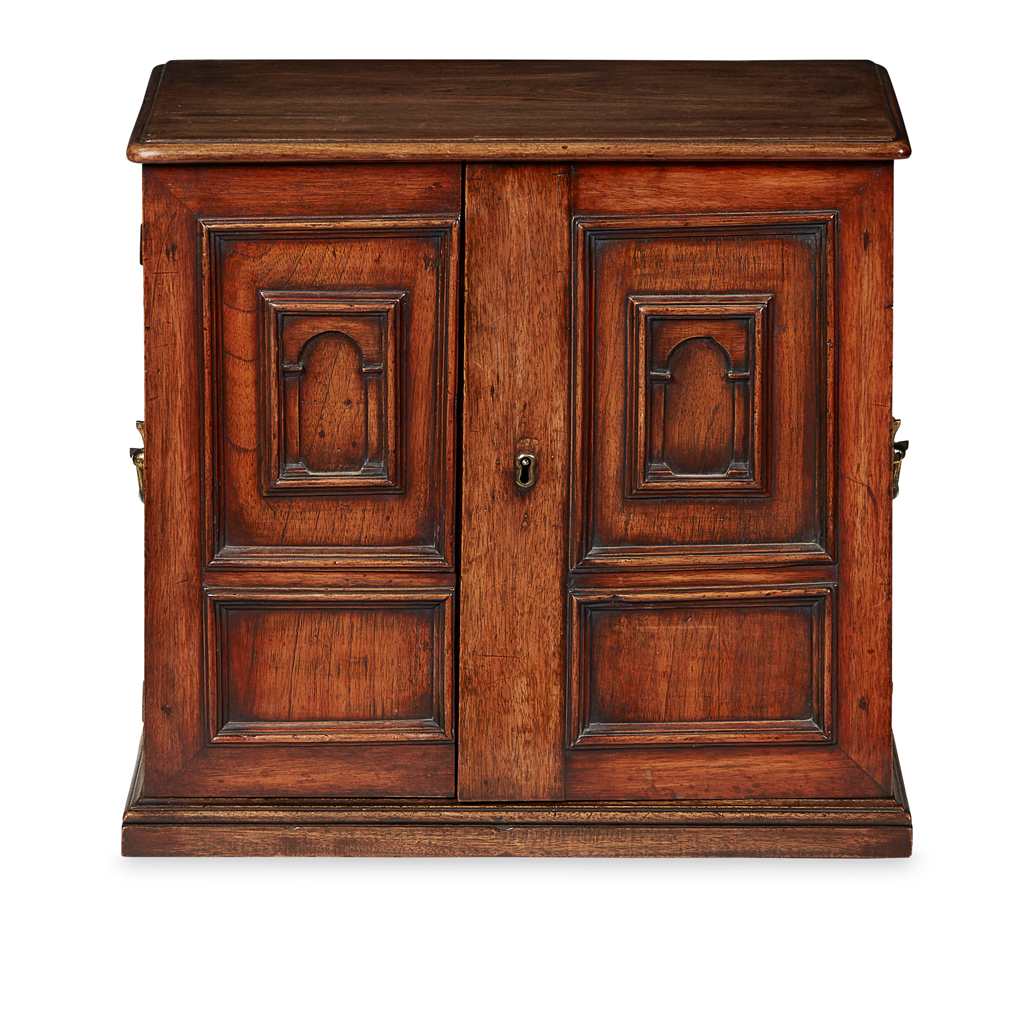 the moulded top above twin panelled doors, enclosing an interior fitted with an arrangement of panelled drawers around a cupboard, with brass handles to the sides