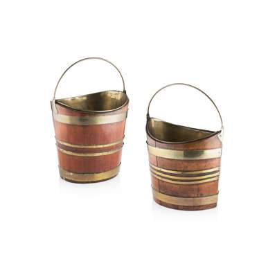 TWO GEORGE III MAHOGANY AND BRASS BOUND PEAT BUCKETS
