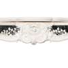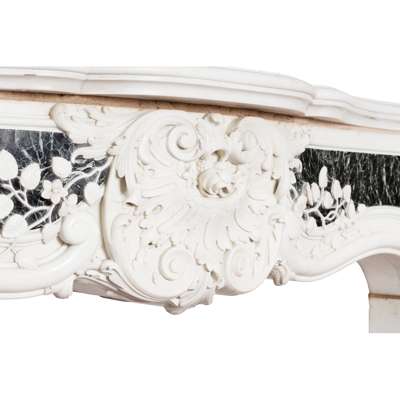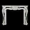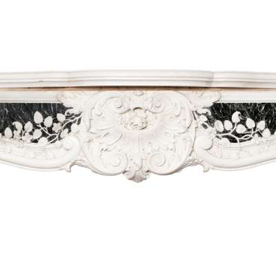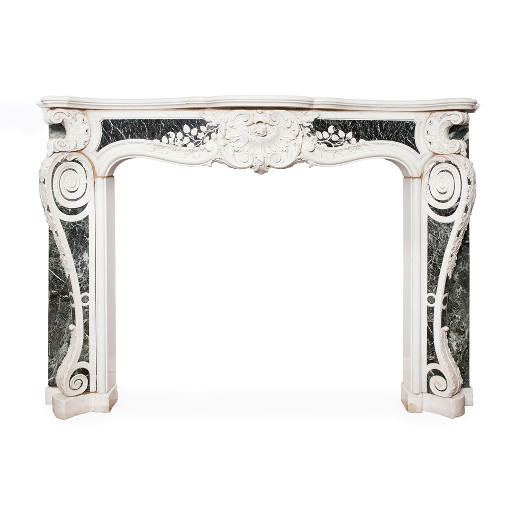 the serpentine-moulded shelf above a frieze centred by a carved cartouche of acanthus and trails of morning glory, the whole terminated by C-scrolls; the canted scrolled jambs, with plain moulded ingrounds, decorated with cartouches and hart's tongue, set on conforming plinth-blocks