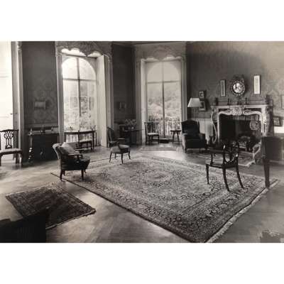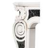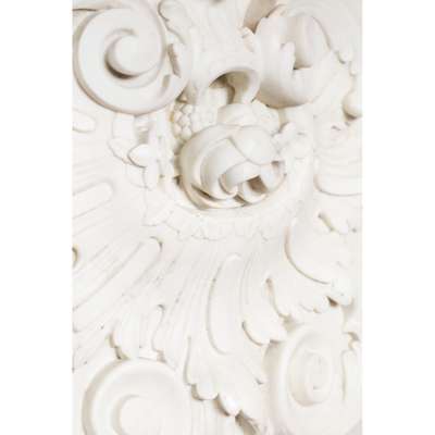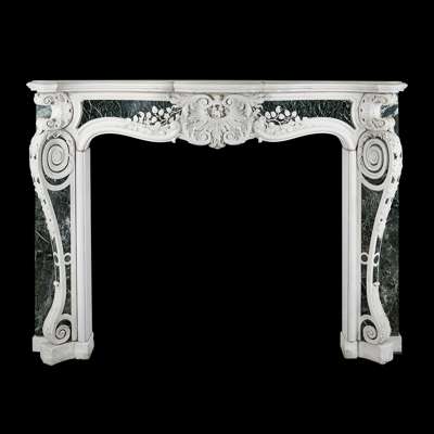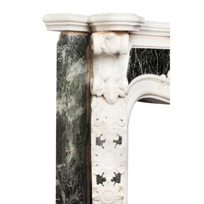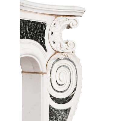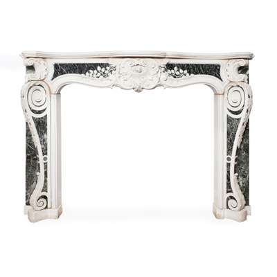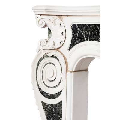 Note: The design for this magnificent statuary marble chimneypiece, which combines French influences with mid 18th century Georgian features in the 'picturesque' manner, is representative of the English Rococo period. The chimneypiece unites strong Palladian influences with the softer, more sinuous lines evolving in the middle of the 18th century and relates to the 'Basso Relievos' and monuments executed around 1750 by the celebrated sculptor Sir Henry Cheere (d. 1781). The very fine carving of the morning glory and floral sprigs spreading out from the central 'pelta' scroll cartouche suggest themes of Dawn, Springtime, and the Feminine, while the bold corner pilasters with their Roman Ionic whorls, cartouches, and triumphal palms speak of the Masculine, drawing on Classicism and Palladian themes. The chimneypiece was installed in the Octagonal Drawing Room of Minto House, in Roxburghshire, by the decorators W. Turner Lord & Co., 120 Mount Street following their estimate for works at Minto dated 18 September 1891.
