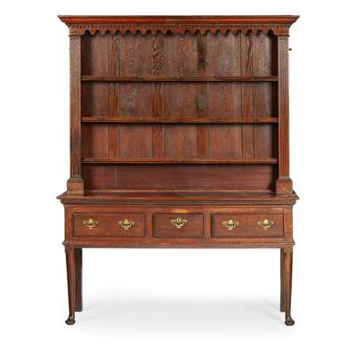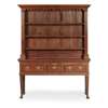 the dentil moulded cornice above a wavy frieze, over a closed back and open shelves flanked by fluted pilasters; the base with three short deep drawers raised on straight legs ending in pad feet