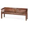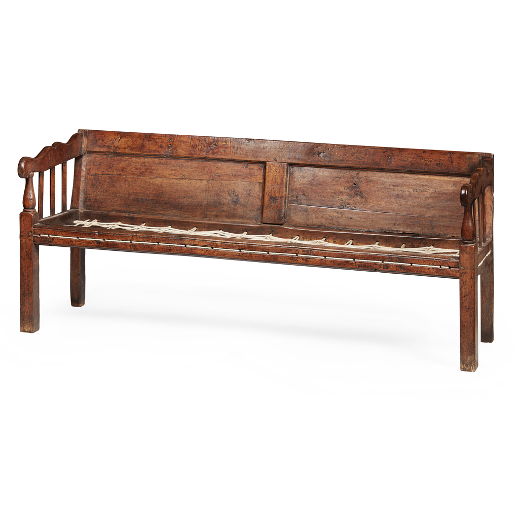 with a panelled back and curved slat-filled arms above a rope seat, raised on square legs