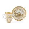 in the Chinese taste with gilt figures, birds, foliage and borders, the underside of the saucer and base of the cup with fluted moulding (2)