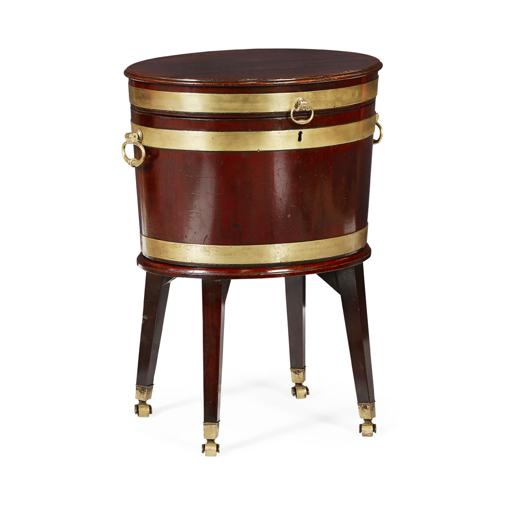 LATE GEORGE III MAHOGANY BRASS BANDED OVAL WINE COOLER