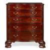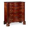 the serpentine top with a moulded edge above five long serpentine drawers flanked by canted stop-fluted angles, raised on robust ogee bracket feet