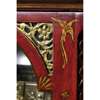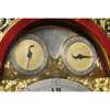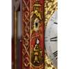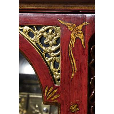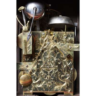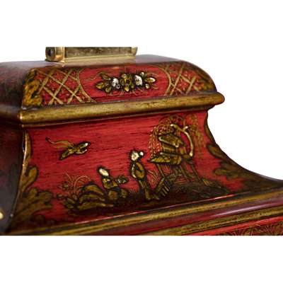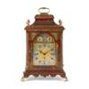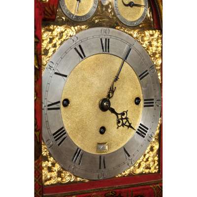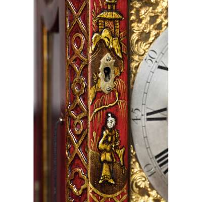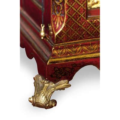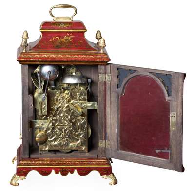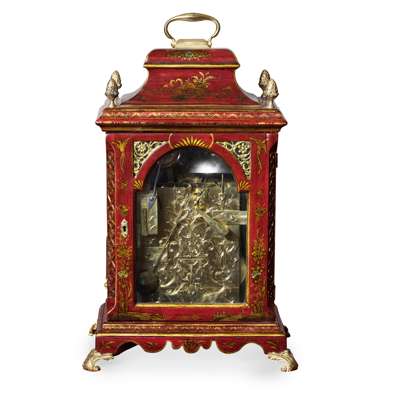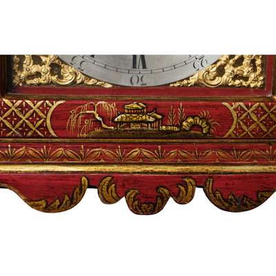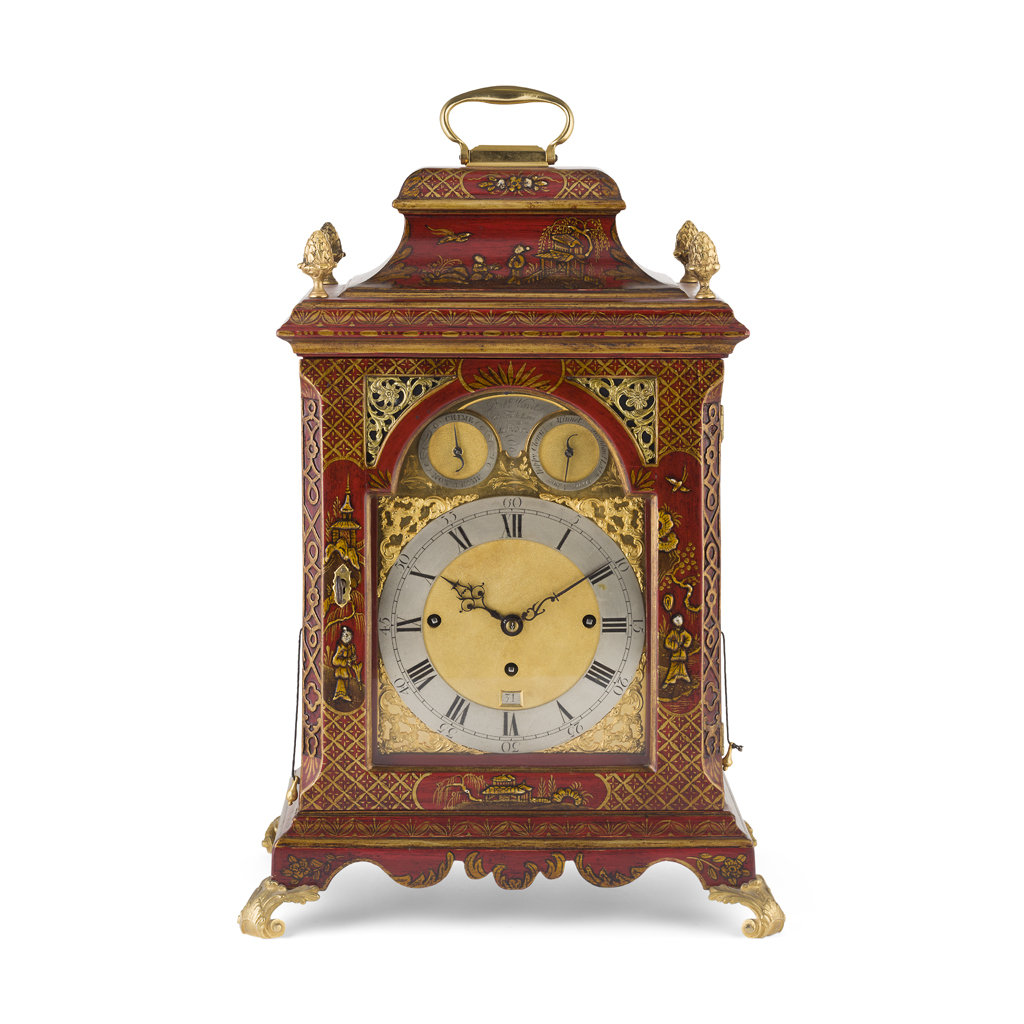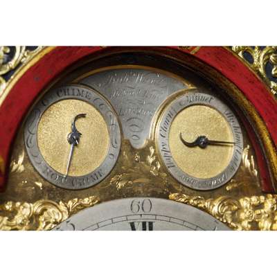 the bell top case with a brass carrying handle and mounted at the corners with brass pine cone finials, the arched brass dial with a silvered chapter in Arabic and Roman numerals and pierced brass spandrels, three winding holes and a date aperture, the arch with a signed plate inscribed 'Robt Ward/ Abchurch Lane/ LONDON' and flanked by subsidiary dials, one 'Chime/Not Chime', the other tune selection 'Minuet/Highland Lady/ Lovely Nancy/ Happy Clown'; above a shaped apron and raised on gilt metal acanthus scroll feet, the eight-day three train movement striking a bell and chiming on eight bells, enclosed by a foliate engraved backplate, pull cord repeat to the right side, tune pull cord to the left side; the red lacquer case decorated with Chinese figures, temples and trellis pattern with blind fret angles highlighted with gilt details