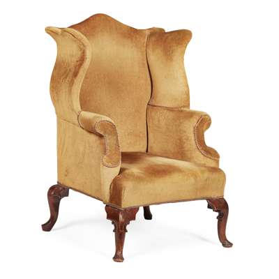 the upholstered back with a serpentine toprail and wings above a stuffover seat flanked by scroll arms, raised on cabriole legs ending in pad feet; in gold plush upholstery