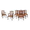 the arched top rails carved with palmettes above triple arch tracery and ribbon-tied backs, the drop-in seats raised on cabriole legs carved at the knees with shells and ending in claw and ball feet; comprising a pair of armchairs and six side chairs (8)