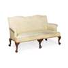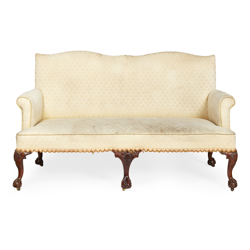 the serpentine top rail above a straight padded back and scroll arms, over a serpentine seat, raised on cabriole legs carved at the knees with shells and ending in claw and paw feet with recessed brass castors