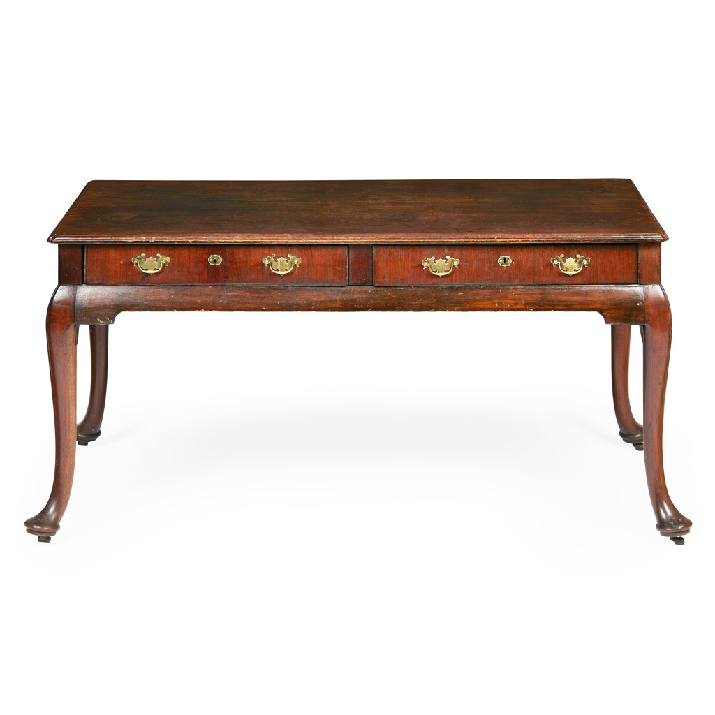 the rectangular top with a moulded edge above two short frieze drawers, raised on cabriole legs terminating in pad feet with leather-covered countersunk brass castors