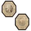 of octagonal form, with oval reserves depicting a lady within a floral border, in an ebonised frame (2)