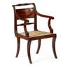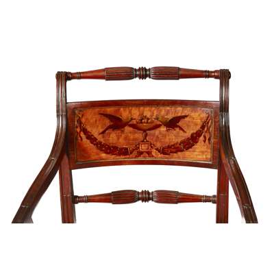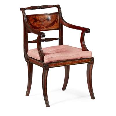 FINE LATE GEORGE III MAHOGANY, SATINWOOD AND PAINTED ARMCHAIR