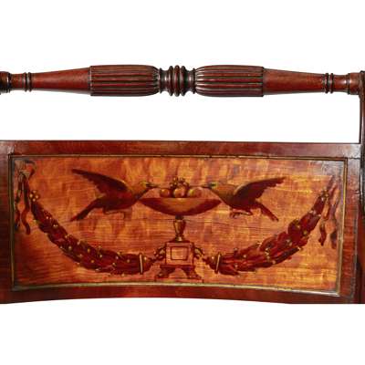 the turned and reeded back rails enclosing a central panel painted with birds and swags, above curved reeded arms and a caned seat with squab cushion, raised on sabre legs