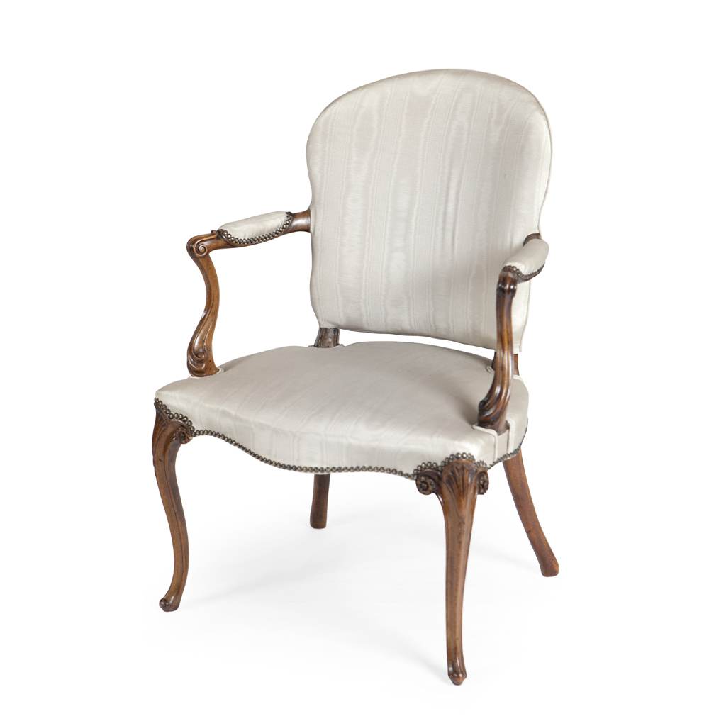 in the French Hepplewhite style, the cartouche shaped back over part padded arms and a stuff over seat, in pale green/grey silk upholstery, raised on shell and flower carved cabriole legs ending in scrolled toes