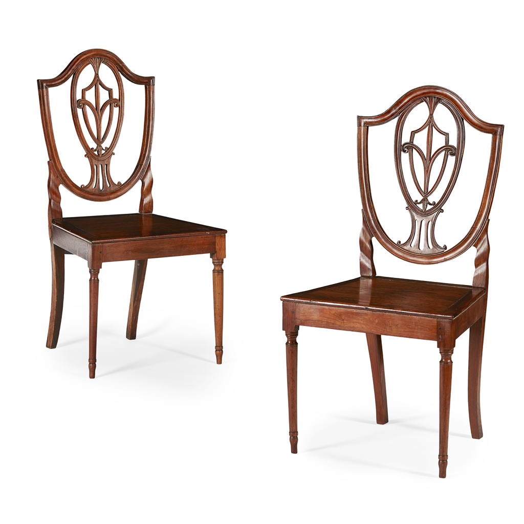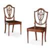 with shield backs with oval pierced and carved splats, above panel seats raised on tapering front legs (2)