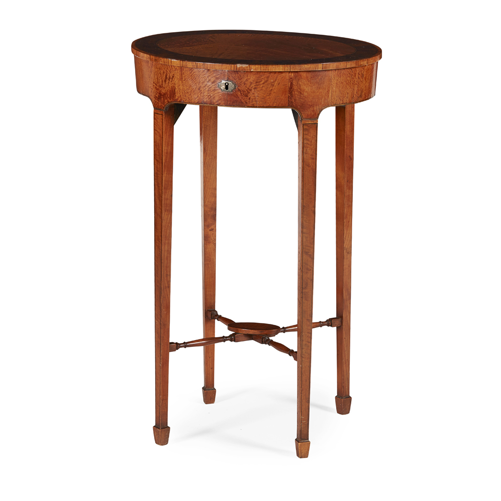 the oval hinged top with yew and satinwood banding and enclosing a later paper-lined interior, raised above a plain frieze on square tapering legs with ebony lines joined by a turned cross stretcher, centred by a small undertier