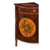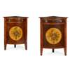 GOOD PAIR OF LATE GEORGE III HAREWOOD, SATINWOOD AND POLYCHROME BOWFRONT ENCOIGNURES, PROBABLY IRISH