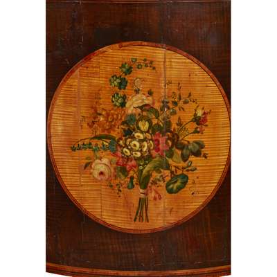 the tops with oval panels painted with flower garlands, above frieze drawers and bowfront cupboard doors with circular panels painted with flower bouquets, raised on square tapered legs ending in spade feet (2)