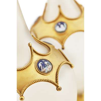 PAIR OF GILT METAL AND PORCELAIN MOUNTED FROSTED GLASS DECANTERS
