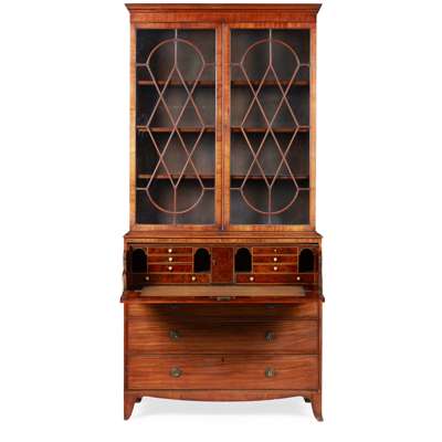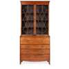 the moulded cornice above a pair of astragal glazed doors opening to shelves; the projecting base with a secretaire drawer fitted with drawers and pigeon holes, above three further long graduated drawers, raised on splay feet