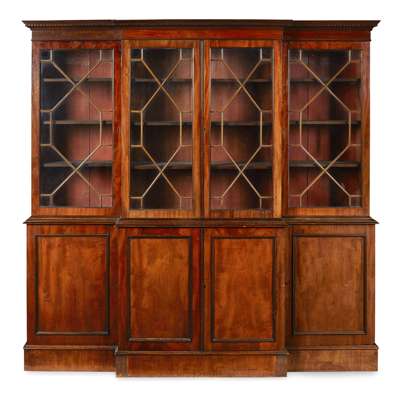 the dentil moulded breakfront cornice above astragal glazed door opening to shelves; the base with moulded cupboard doors on a plinth base