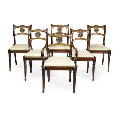 SET OF SIX REGENCY GRAIN-PAINTED AND BRASS INLAY DINING CHAIRS