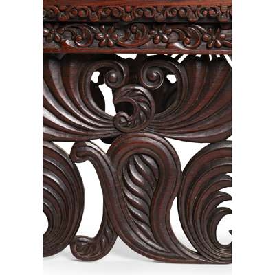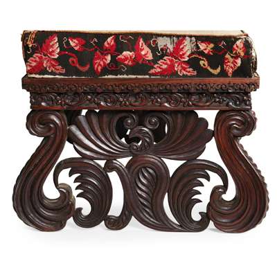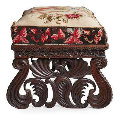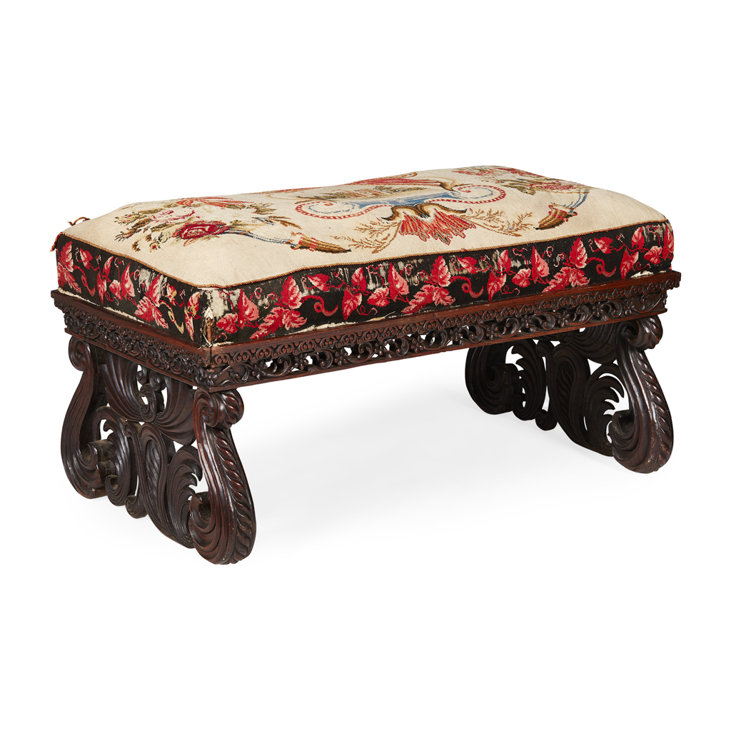 the rectangular needlework upholstered seat above a rosette and leaf carved and pierced frieze supported on elaborate scroll and leaf-carved end supports