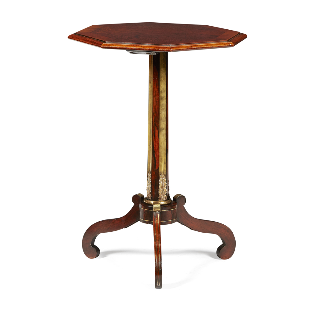 FINE REGENCY ROSEWOOD, THUYA WOOD, AND BRASS MOUNTED OCTAGONAL TRIPOD TABLE, IN THE MANNER OF JOHN MACLEAN