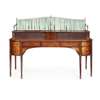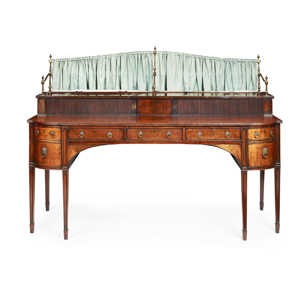 the superstructure with a brass gallery rail and tambour doors above a shaped bowfront top with a reeded edge and three short frieze drawers, flanked by deep drawers and raised on square tapered legs ending in spade feet