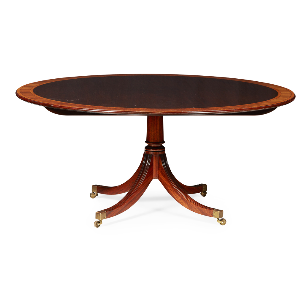 REGENCY STYLE MAHOGANY, SATINWOOD AND KINGWOOD BANDED BREAKFAST TABLE BY WILLIAM TILLMAN