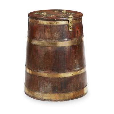 the circular hinged top with brass strap hinges above a tapered staved body with brass bands