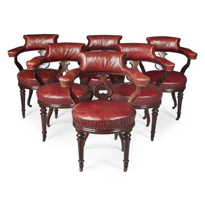with buttoned red leather upholstered backs and arms with curved supports and pierced splat raised above stuffover seats with close nailed decoration raised on turned and fluted tapering legs, terminating in castors (6)