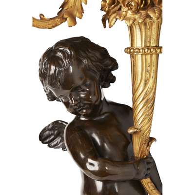the standing bronze figure of Cupid holding a flower filled torchere issuing five scrolling acanthus clad candle arms, on a circular marble column and shaped square base with floral garland bronze mounts