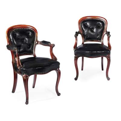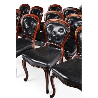 in black leather upholstery, the moulded, curved and button-tufted backs above serpentine stuffover seats, raised on moulded cabriole legs; comprising twenty side chairs and five armchairs (25)
