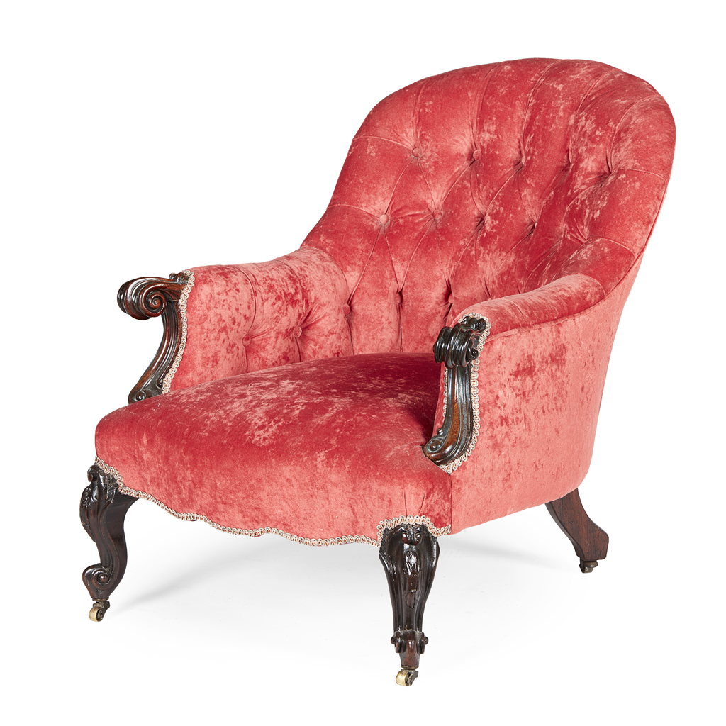 the curved button upholstered back over a deep seat and enclosed arms ending in scroll carved handholds, raised on foliate carved cabriole legs ending in scrolled toes with brass castors