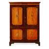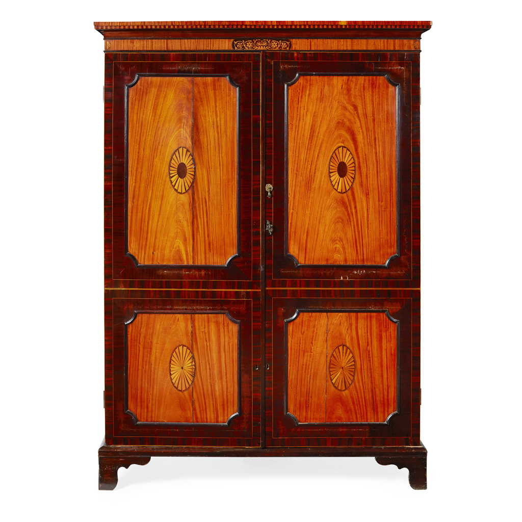 the dentil moulded cornice above a pair of moulded doors with fan medallion inlay, opening to hanging space, raised on shaped bracket feet