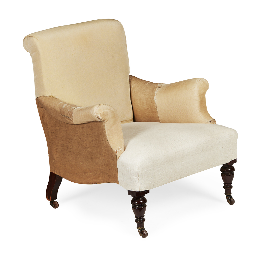 the upright scrolled back above a stuffover deep seat and curved scrolled arms, on turned mahogany feet with porcelain castors; the rear leg stamped with serial no. 'B8664'
