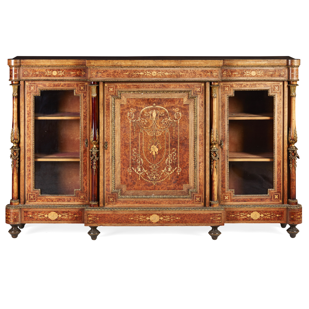 VICTORIAN WALNUT, INLAY AND GILT METAL MOUNTED CREDENZA