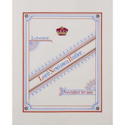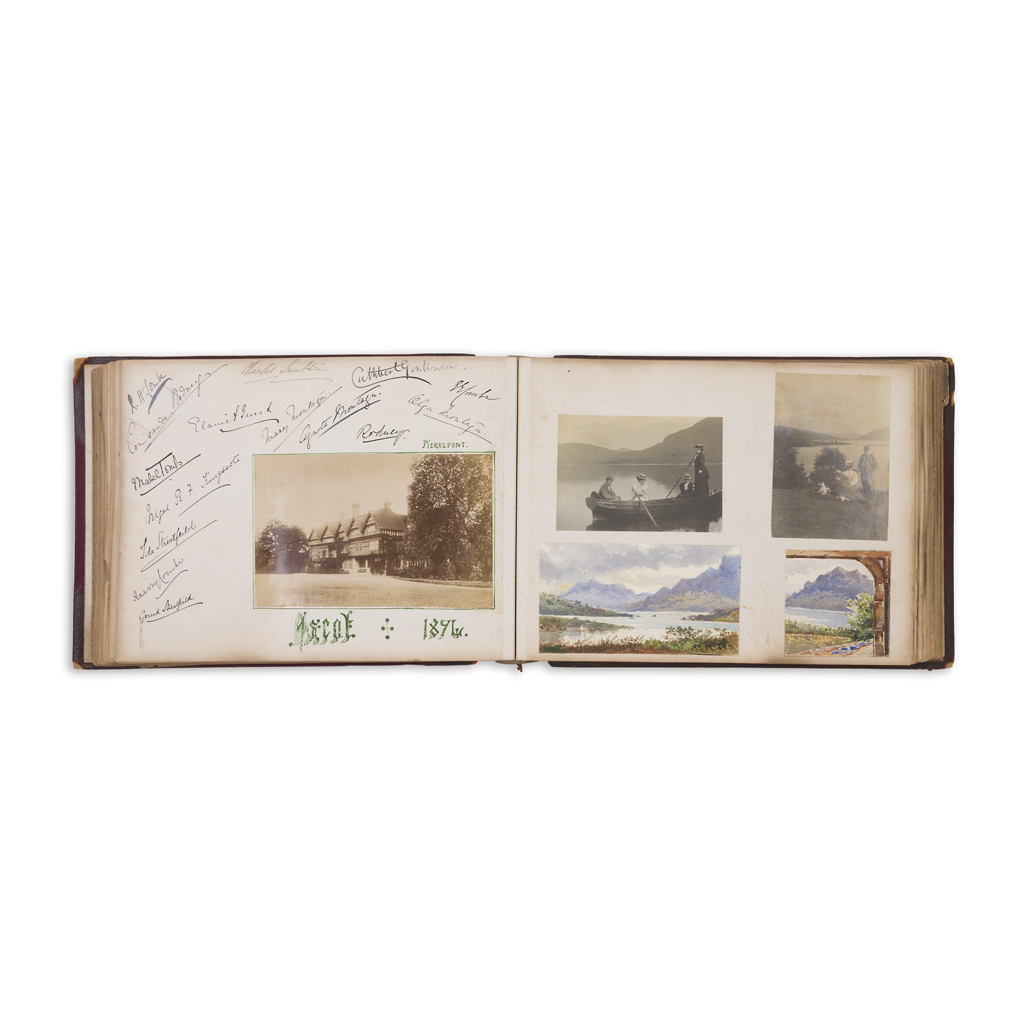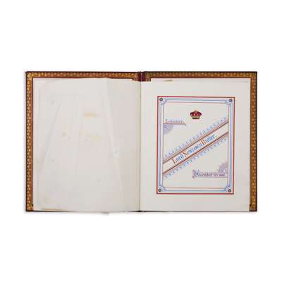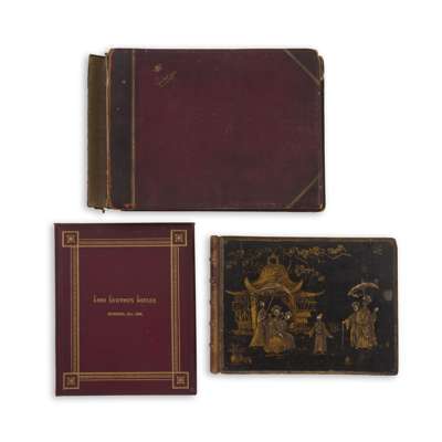 associated with the 7th Earl and Countess Lanesborough and Swithland Hall, Leicestershire; the first bound in red Moroccan leather embossed 'Gwladys' with a coronet, containing signatures, photographs and sketches of houses and guests mostly dating to the late 19th century; the other with Chinese lacquer boards, title page inscribed 'Broadlands, June 1925', with signatures dating to 2015'; together with a RED MOROCCAN LEATHER BOUND PRESENTATION FOLIO, the cover embossed 'LORD NEWTOWN BUTLER/ DECEMBER, 12TH. 1886' (3)