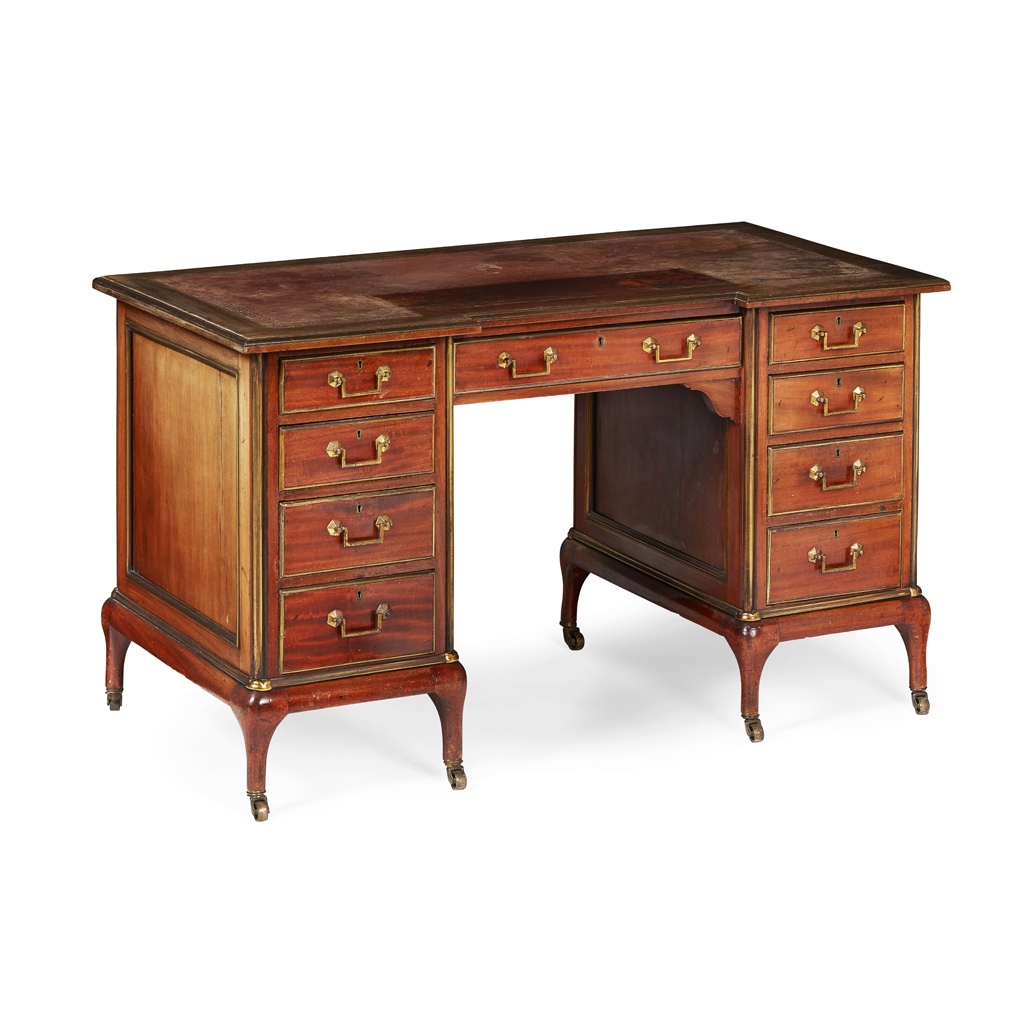 EDWARDIAN MAHOGANY BRASS BANDED KNEEHOLE DESK