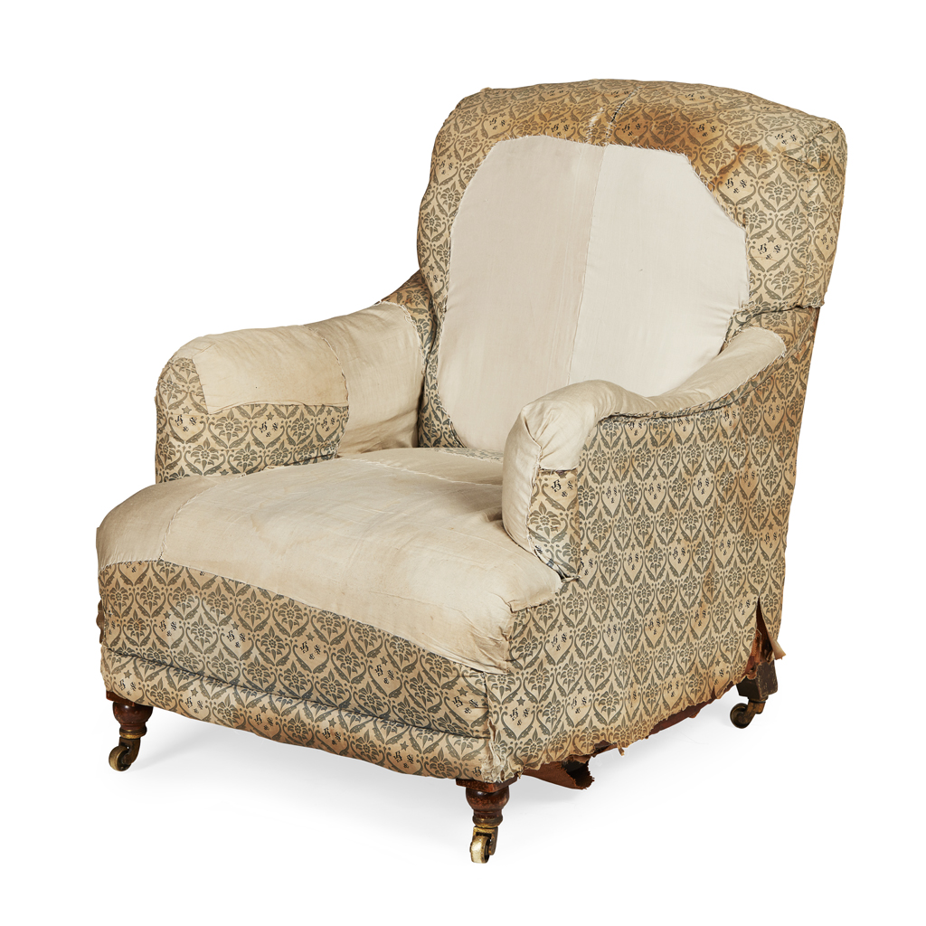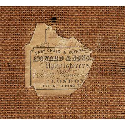 the low 'siege de duvet' back above a stuffover seat and curved low arms, partially upholstered in original H & S monogram ticking, on turned mahogany legs with brass castors stamped 'HOWARD & SONS / BERNERS STREET', the rear leg stamped HOWARD & SONS / BERNERS STREET / LONDON' with serial no. 15558 / 1050; the underside with a partial original makers label