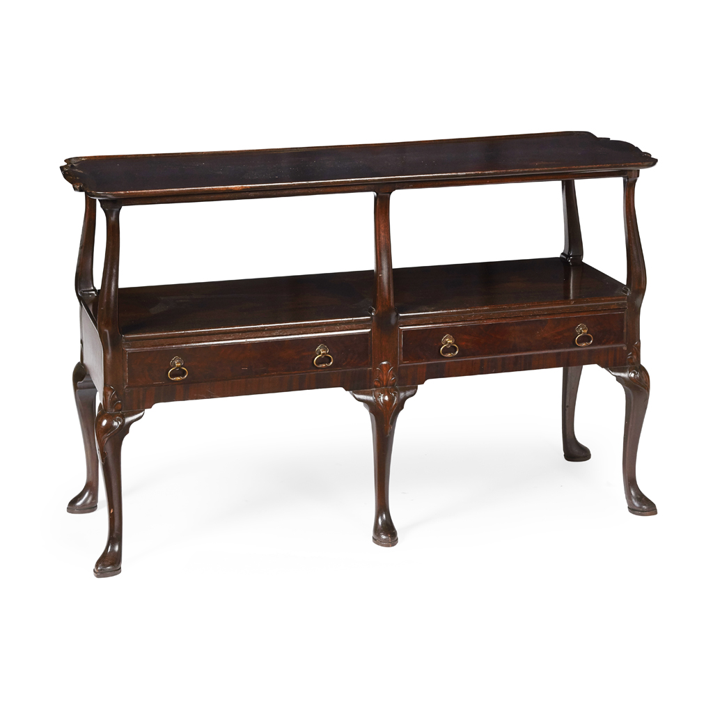 the long tray top on curved supports above an open undertier with two long drawers, raised on leaf carved cabriole legs ending in pointed pad feet, stamped WHYTOCK AND REID