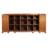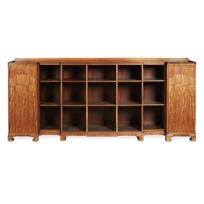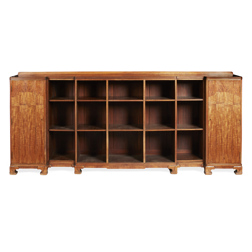 of inverted breakfront outline, with central open shelves flanked by cupboards with fluted cupboard doors, raised on short scroll feet