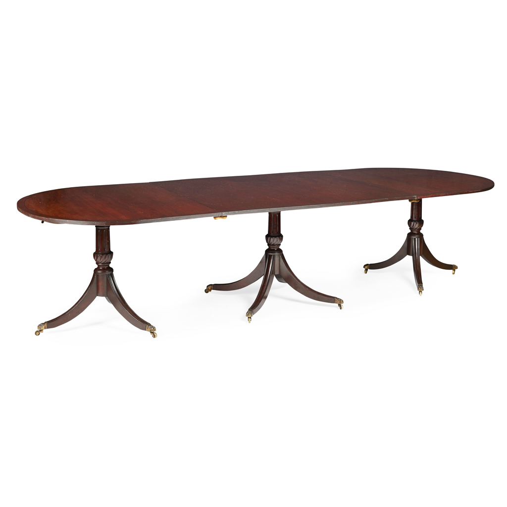 GEORGE III STYLE MAHOGANY TRIPLE PEDESTAL DINING TABLE