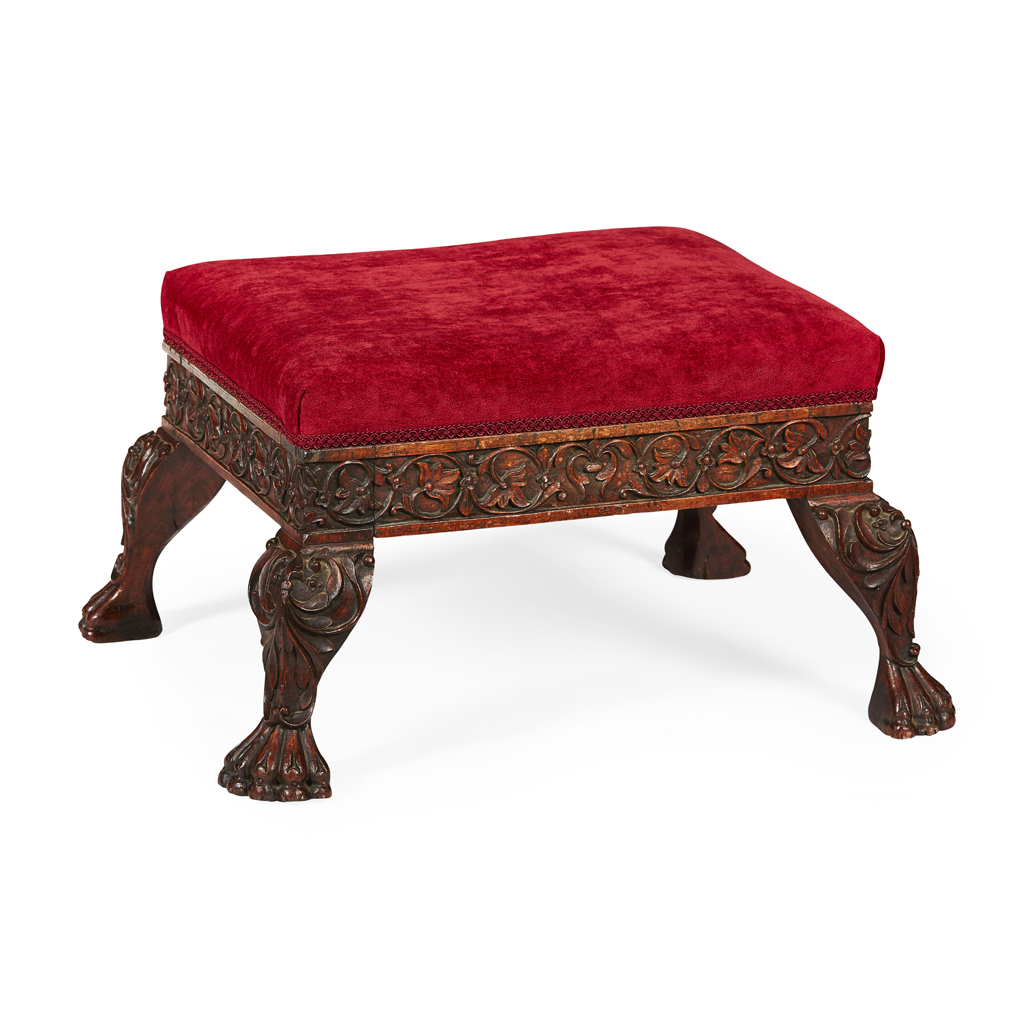 the rectangular padded seat over a foliate carved seat rail, raised on boldly carved cabriole legs ending in carved paw feet