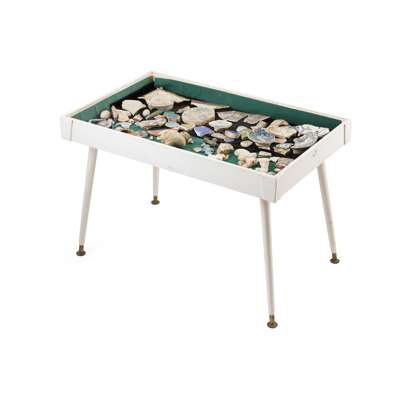 comprising a number of pieces, some with labels for Tehran, Gonbad-e Qabus, and Alamut, including fragments of dishes, figures and glasses, along with some hardstone and stone elements, contained in a painted wooden table cabinet raised on splayed legs
