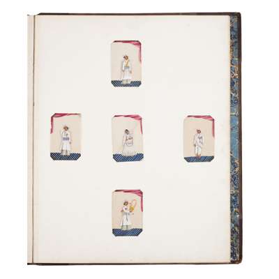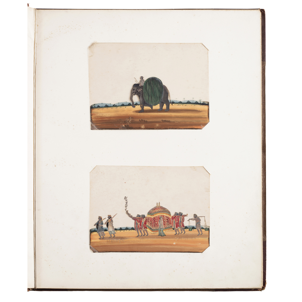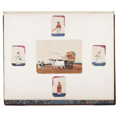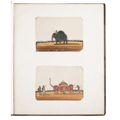 comprising thirty two examples depicting figures in carriages, on elephants, camels and horses, and some smaller individual images of figures, mounted in a bound album