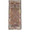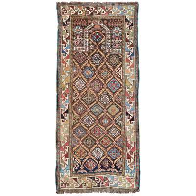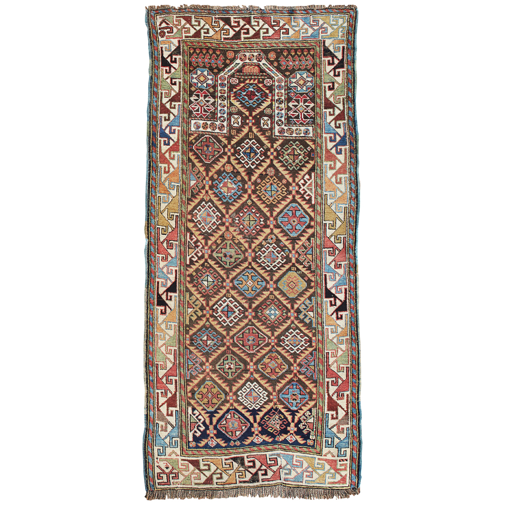 the brown mihrab with allover polychrome geometric lattice pattern, within cream hooked geometric border