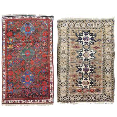 the Shirvan with camel field with four lesghi star medallions, within camel kufic script style border; the Karabagh with brown field with three blue and green medallions, within narrow ivory border (2)