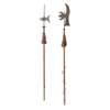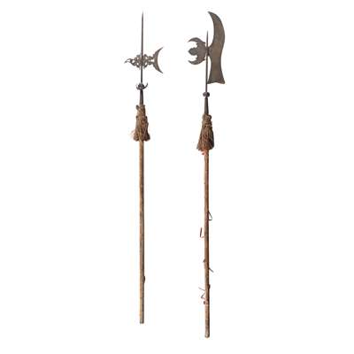 with massive recurved head, shaped cusped rear pean, and terminal spike of square section, etched with scrolling leafy tendrils and a figure in traditional garb, on a stippled ground, spurious date 1524, mounted on a wooden haft with tassel; together with an ETCHED 16TH CENTURY STYLE HALBERD, late 19th/20th century, with openwork head and tapering terminal spike, etched with interlace designs, scrolling foliage and monsters against a stippled ground, on a wooden haft (2)